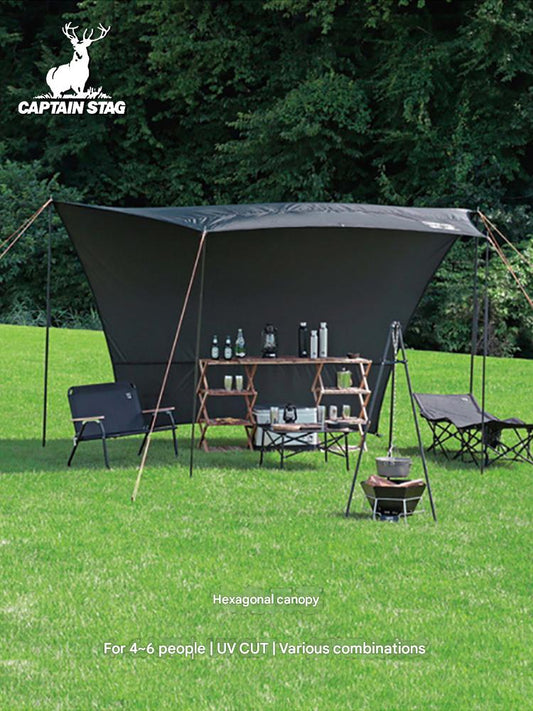 CAPTAIN STAG UA-1069/74/77 Hexagonal Canopy Portable Lightweight Multiple Setups 4-6 Persons CS Black Label Hexagon Tarp Outdoor Camping Tent With Poles