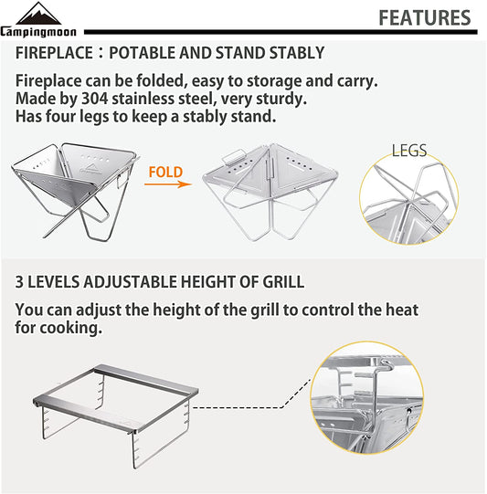 CAMPINGMOON MT PRO Series Camping Outdoor Portable Folding Small Medium Large Charcoal Grill Pure Stainless Steel Foldable Bonfire Pit Fire Wood Stove