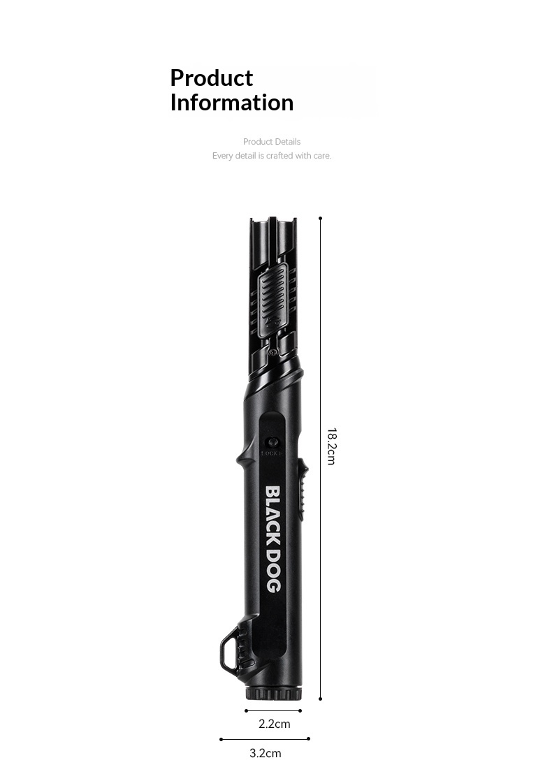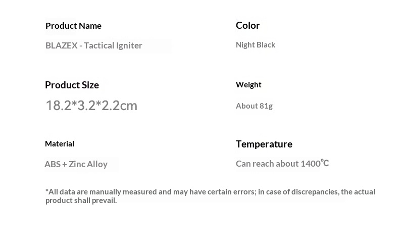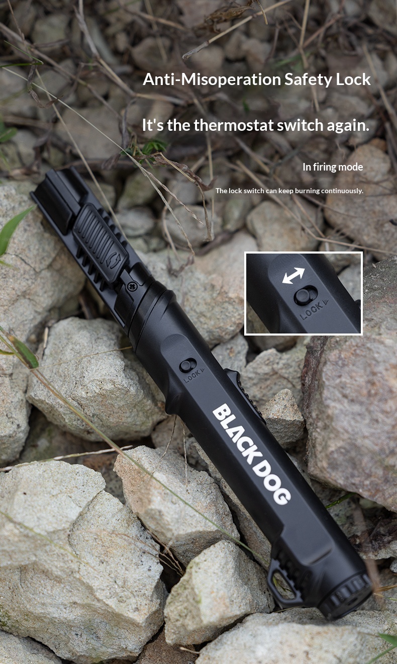 Product Description: Brand: Blackdog Model No: CBD2550PJ075 Product Name: BLAZE X Tactical Igniter Size: 18.2x3.2x2.2 cm EzCamp Weight: 81g Temperature: 1400°C Color: Black Material: ABS, Zinc Alloy Feature: Portability, Heavy Duty