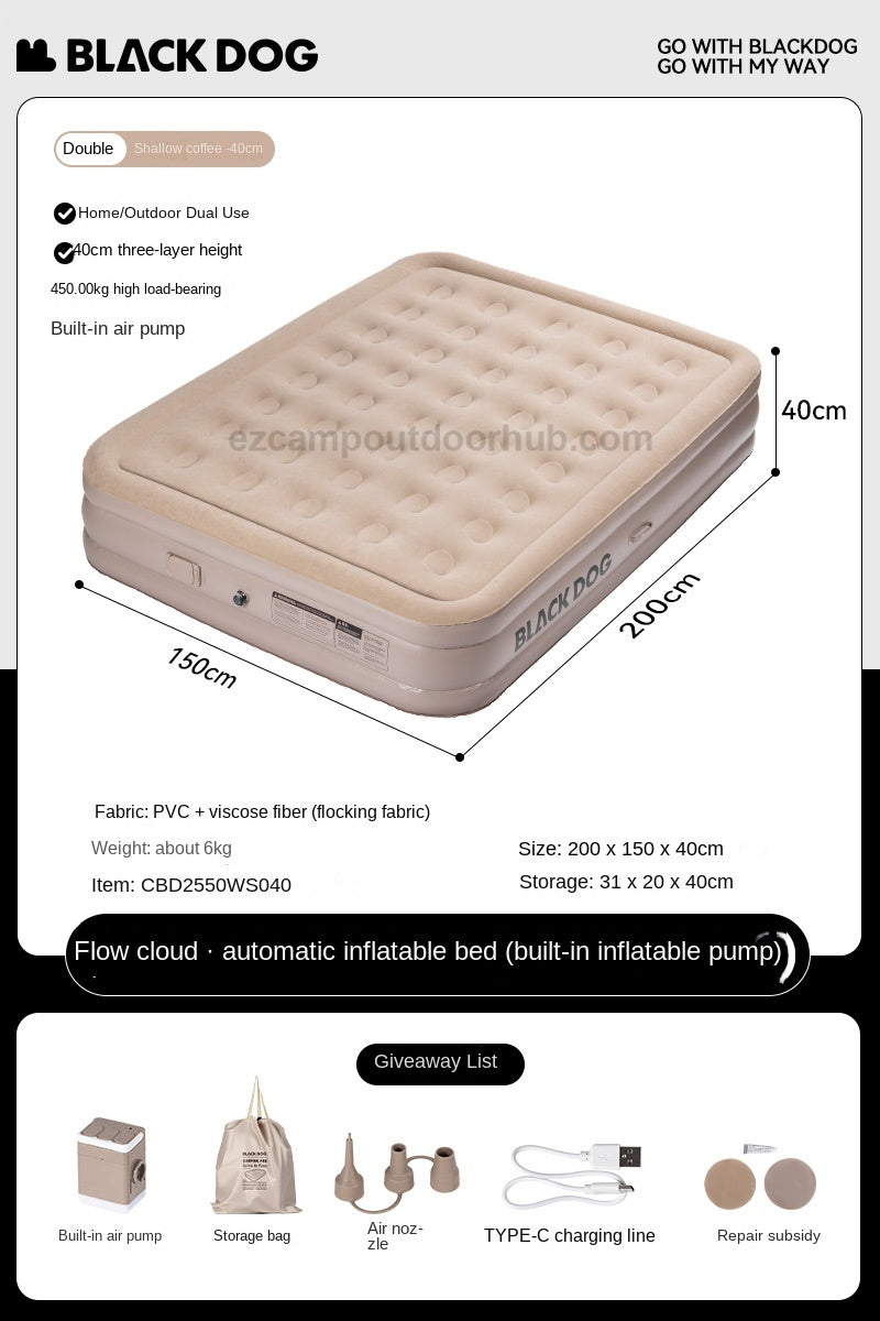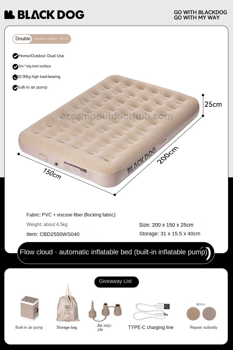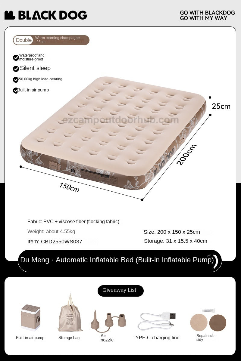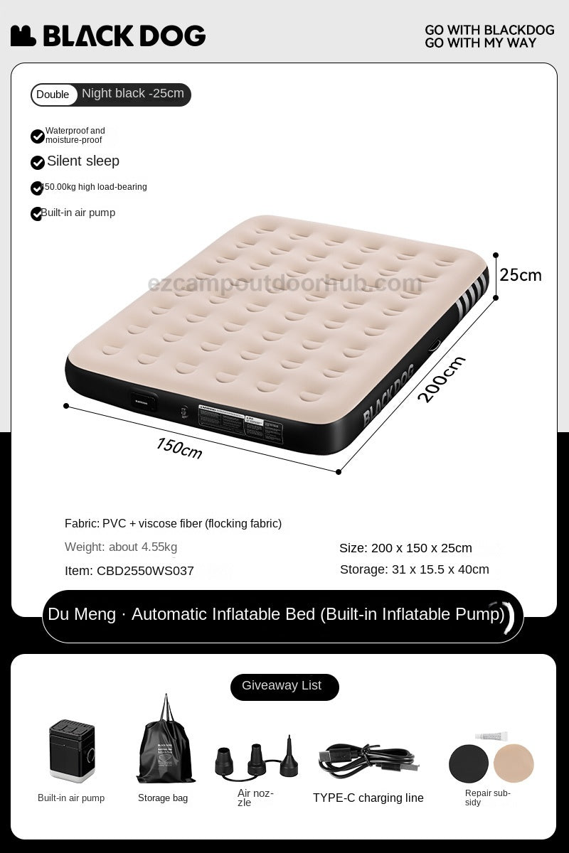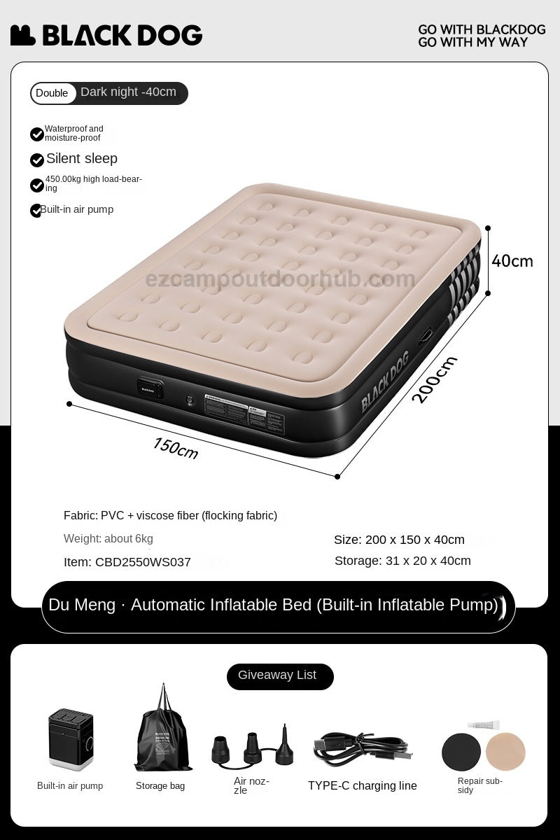 Blackdog CLOUD NEST Automatic Air Inflatable Bed Sleeping Pad 1-2 Persons Camping Home Use Single Queen Size Mattress Built-in Electric USB Charging Air Pump Lamp