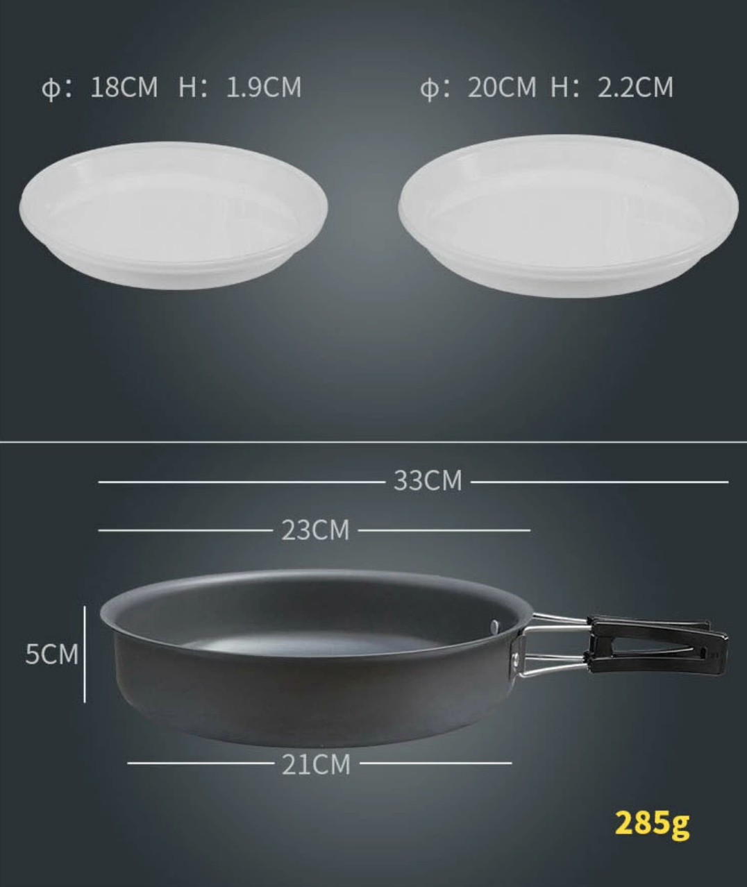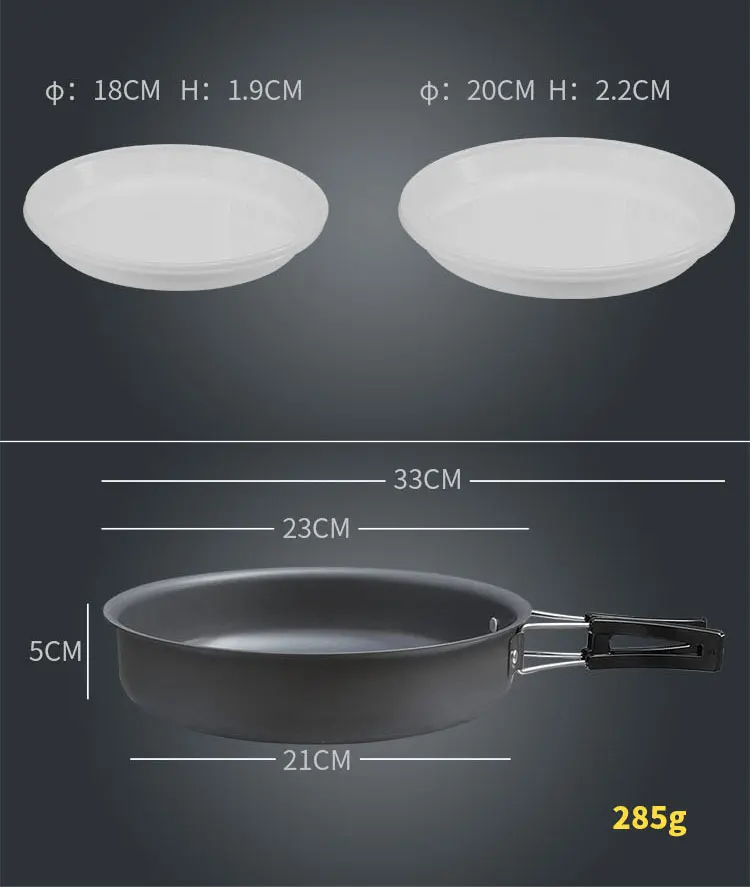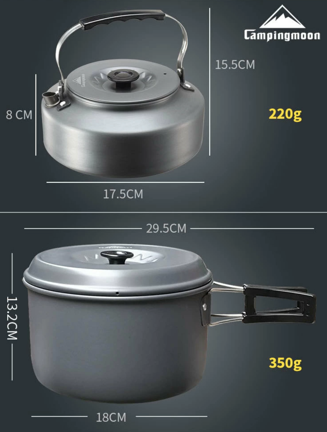 Inludes: 1 Kettle / 1 Rice Pot / 1 Soup Pot / 2 Covers / 1 Pan / Set of Tablewares and Storage Bag