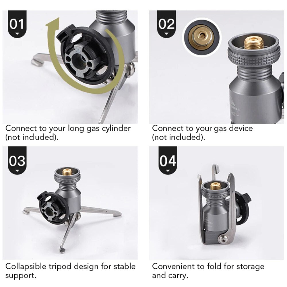 Converts and Mounts a Camping Screw type device into Standard Nozzle Long Canister Butane