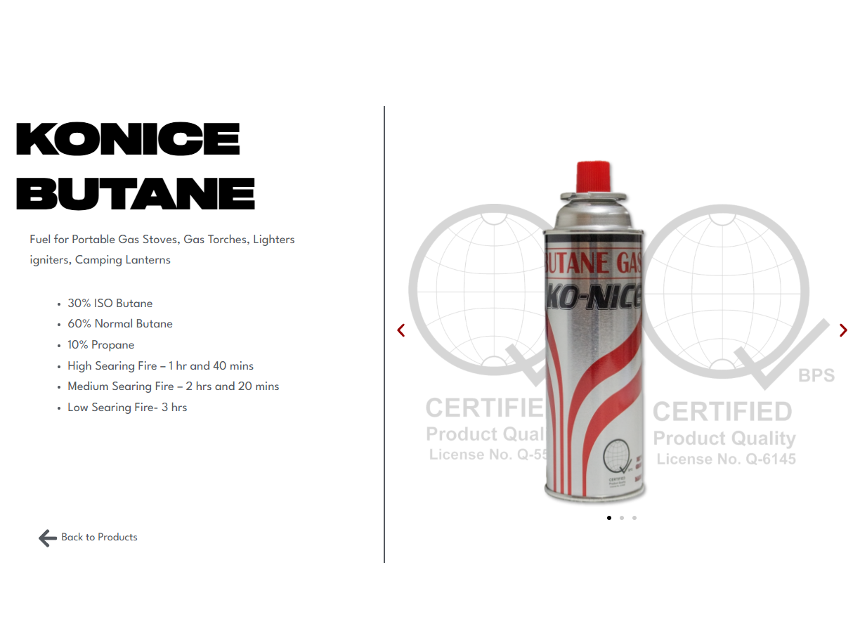 Material: Steel Canister Body, Plastic Safety Cap (Filled with Butane Gas)