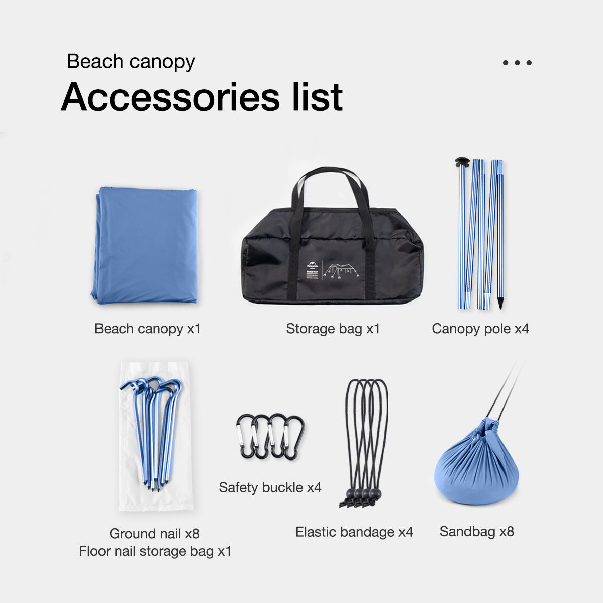 Inclusions: 1 Beach Canopy, 4 Canopy Poles, 8 Ground Nails, 4 Safety Buckle, 4 Elastic Bandage, 8 Sandbag, 1 Storage Bag