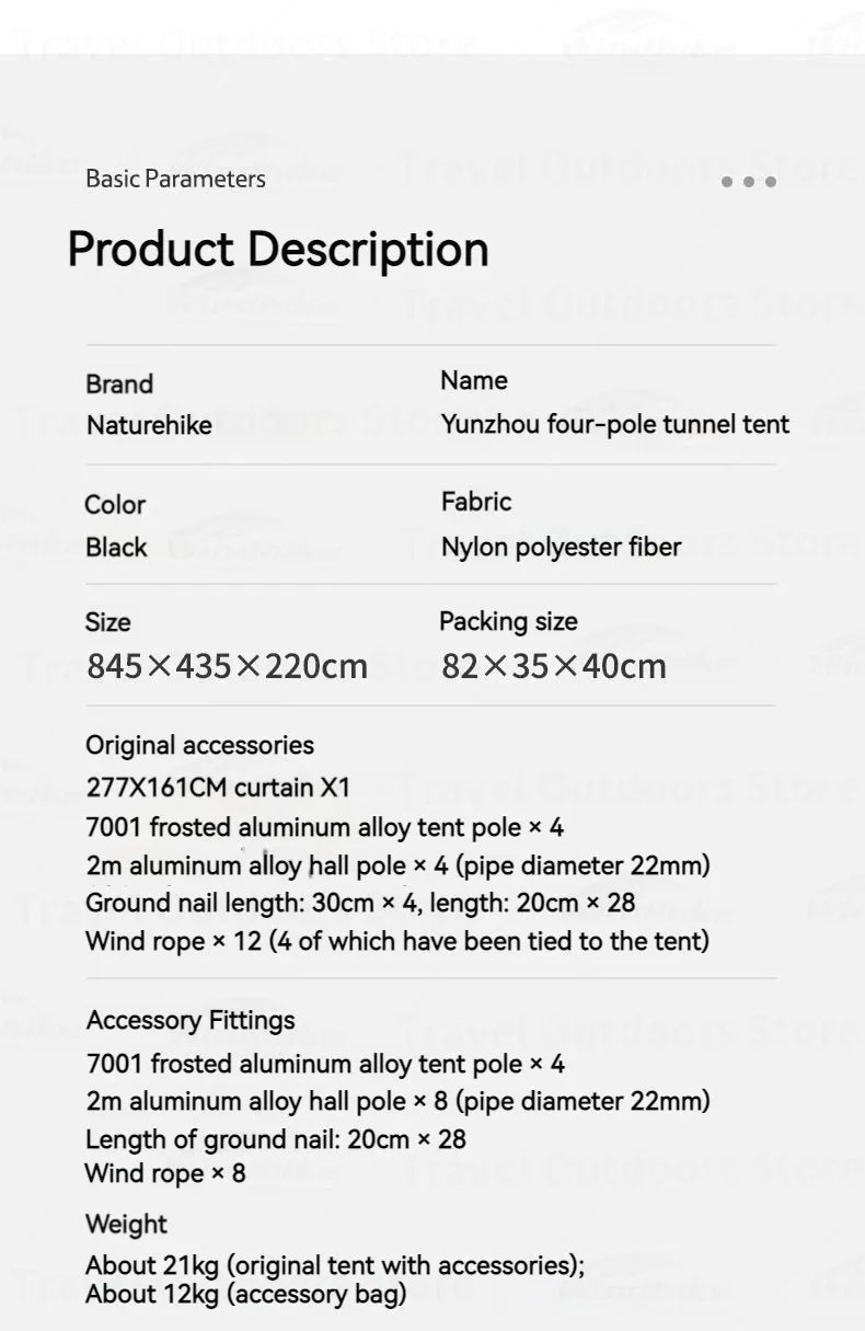 Weight: About 21kg (Original Tent with Accessories)/ About 12kg (Accessory Bag)