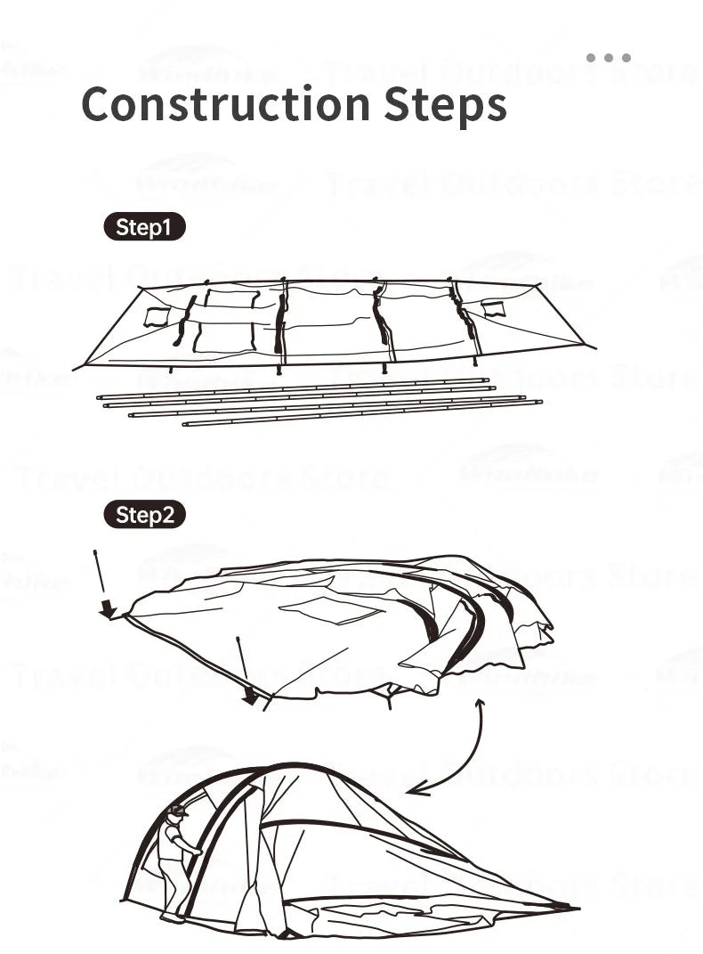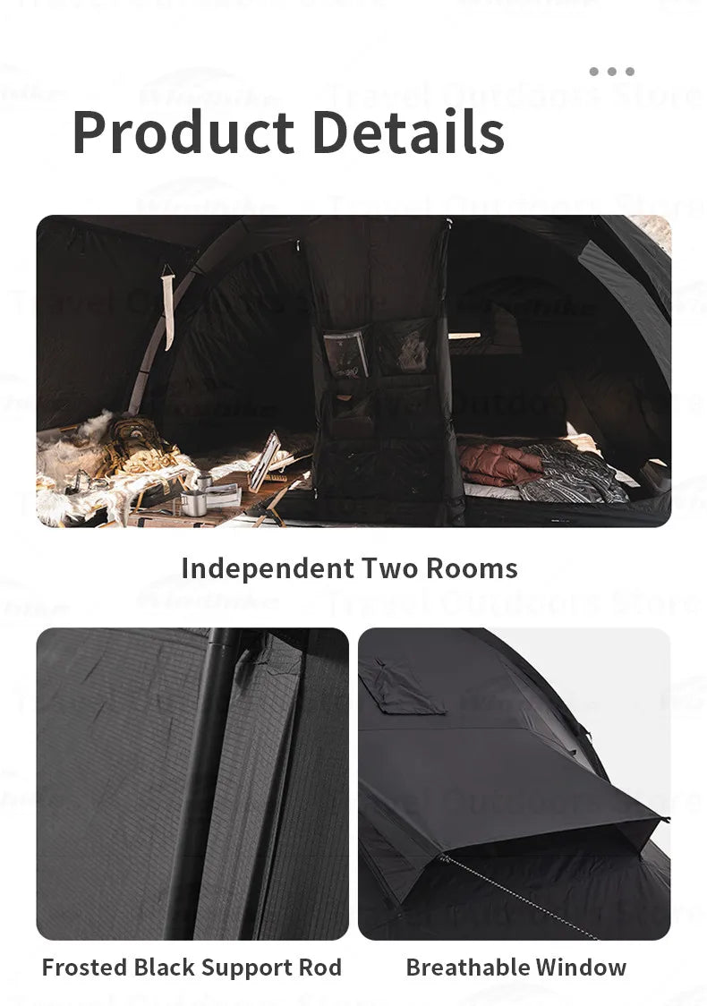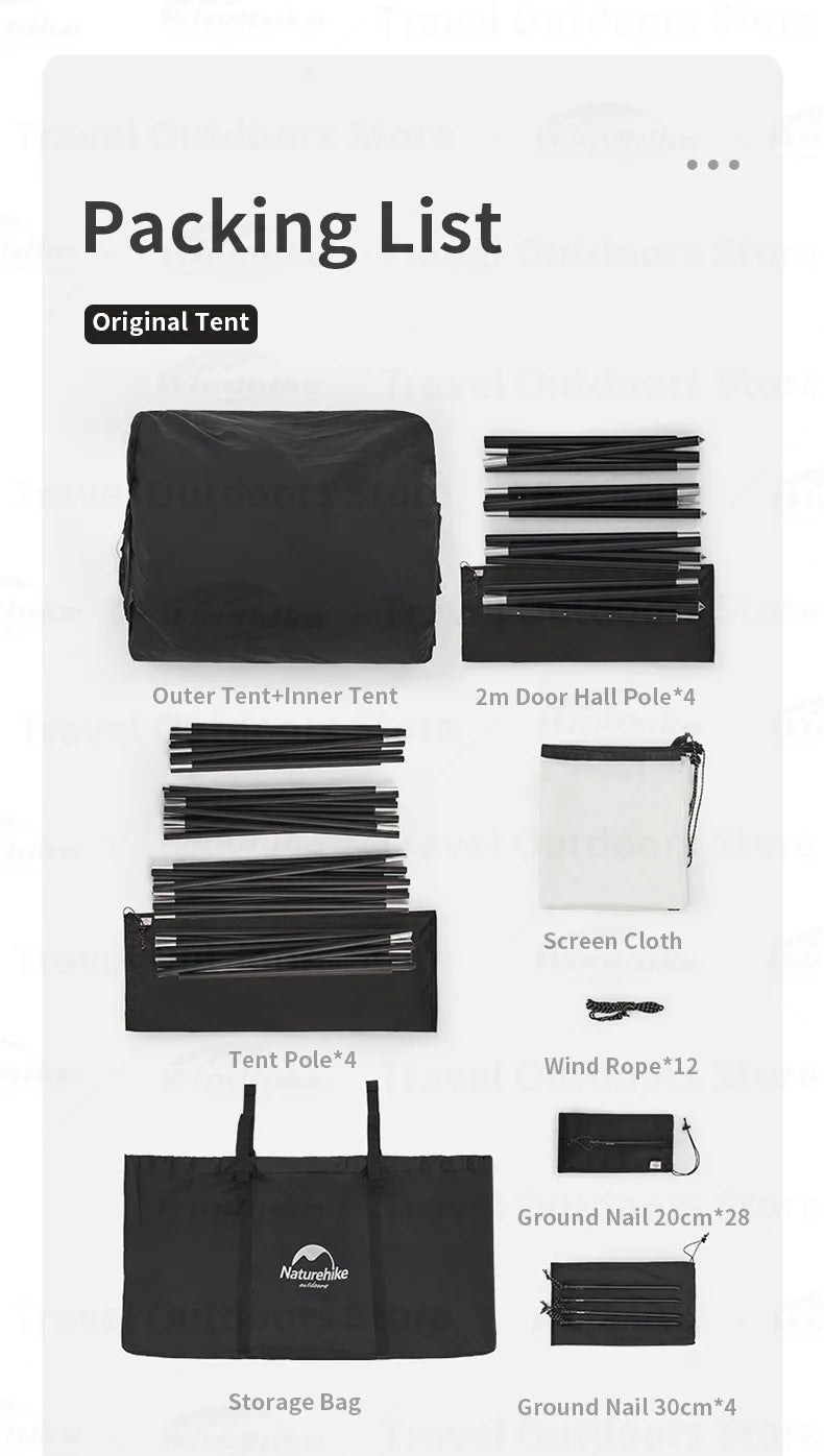 Original Tent Accessories: Outer Tent+Inner Tent / 2m Door Hall Pole*4 / Tent Pole*4 / Screen Cloth / Wind Rope*12 / Ground Nail 20cm*28 / Ground Nail 30cm*4 / Storage Bag