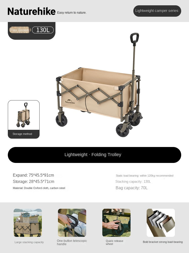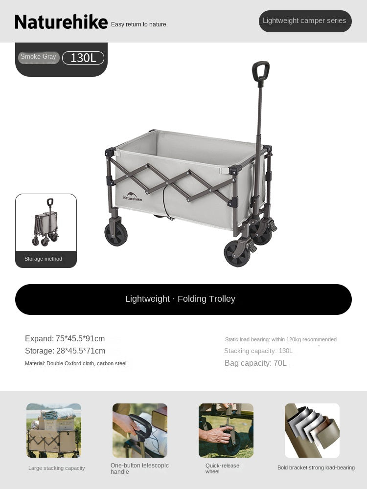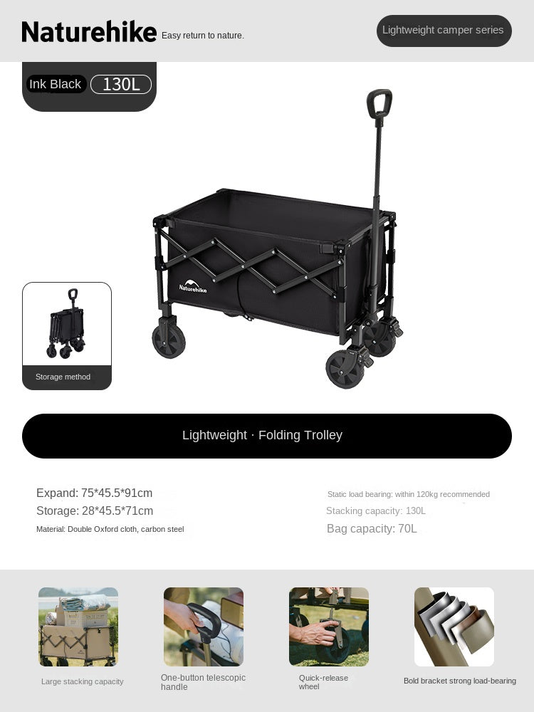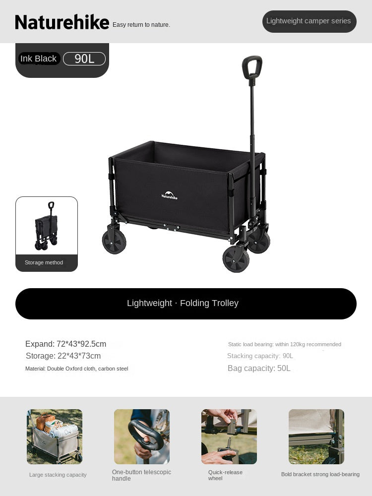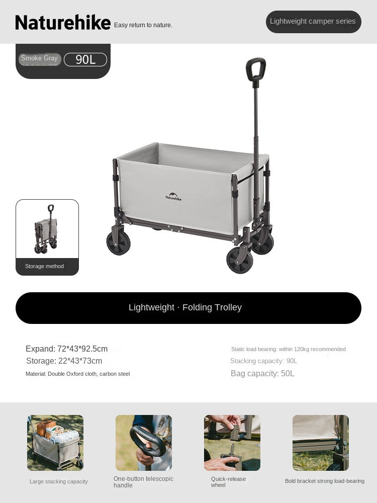 Naturehike Mini Foldable Trolley Cart Multipurpose 50/70L Large Capacity Utility Wagon Carrier Push Cart Outdoor Folding Storage Camping Shopping