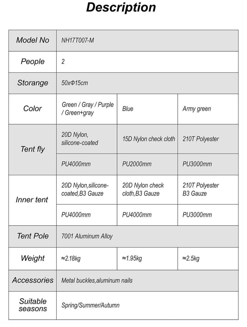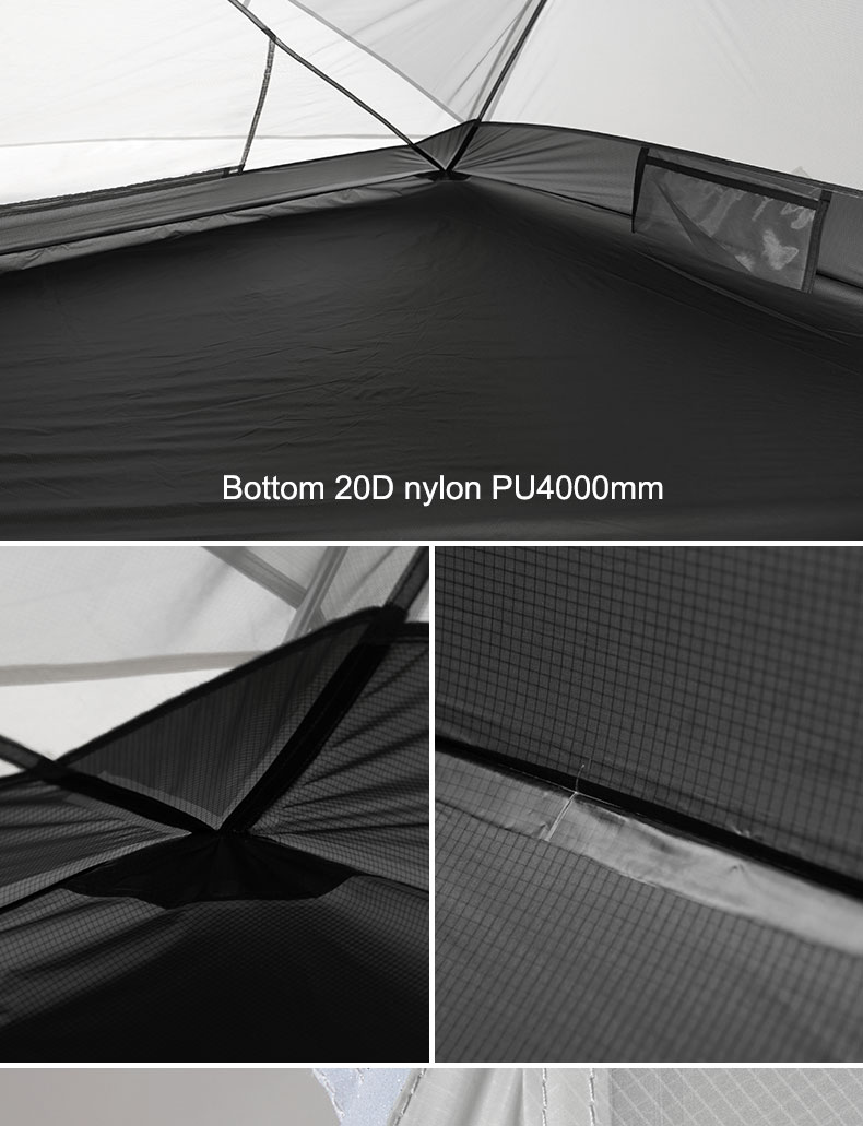 Inner Tent: B3 Gauze+Velvet Proof Silk+15D Nylon Plaid / Waterproof 4000mm