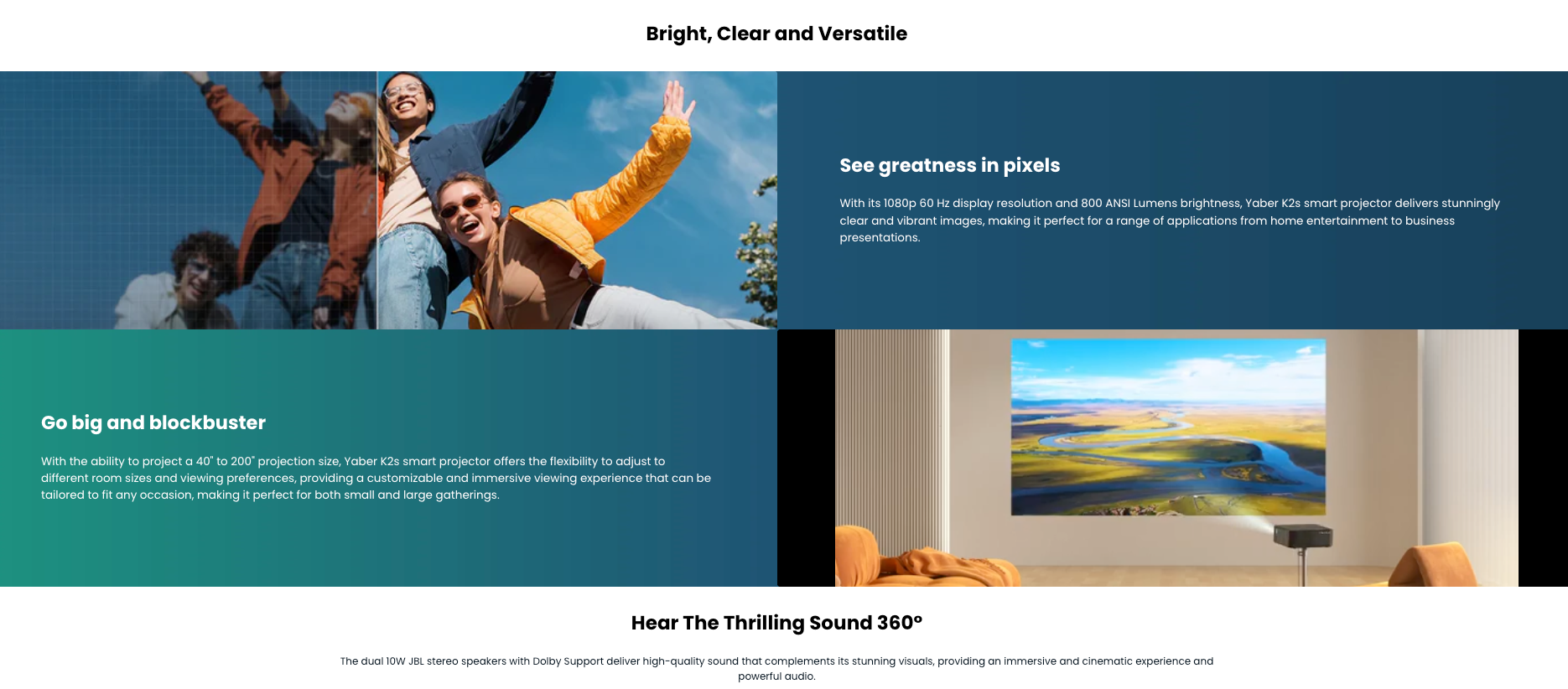 The K2s comes with JBL 10W dual stereo speakers and Dolby Audio support, providing an immersive 360-degree sound experience that complements its high-quality visuals. Additionally, the projector is equipped with a built-in TV dongle that grants access to over 7,000 apps, turning it into a versatile entertainment hub. With a low-noise cooling system and energy-saving features, it operates quietly, keeping noise levels below 28 dB.