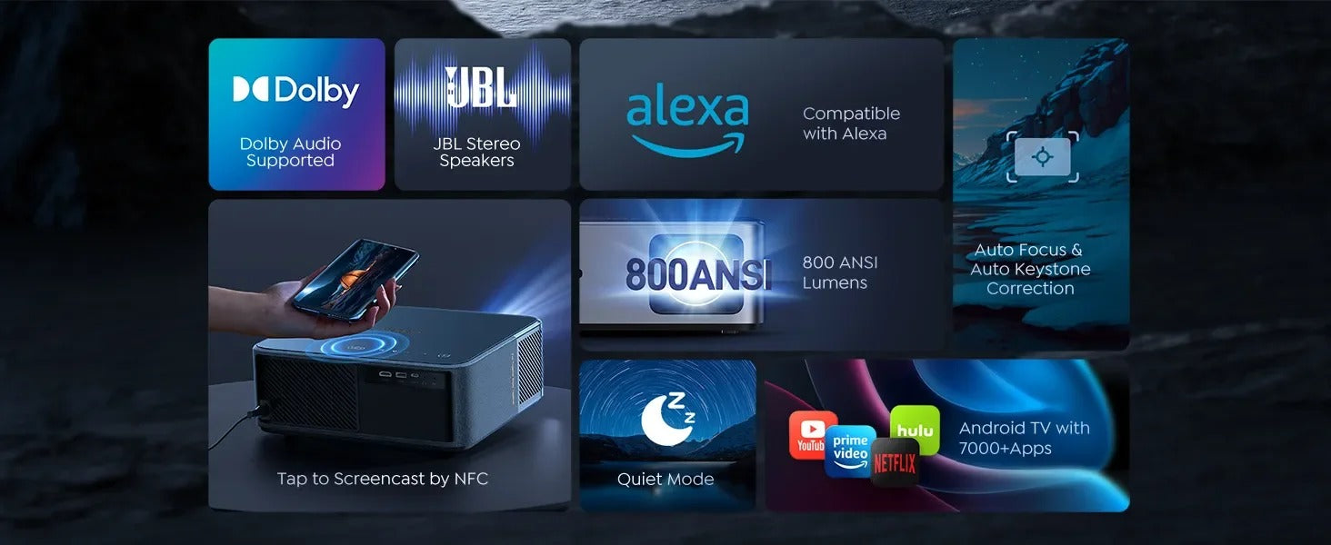 Include auto focus and auto keystone correction, which ensure hassle-free image alignment and focus, perfect for quick setup. It also integrates NFC screencast, allowing users to easily project content from their NFC-enabled devices with just a tap. Voice control through Amazon Alexa further enhances its user-friendliness.